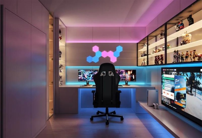燈光設(shè)計(jì)在電競(jìng)房中至關(guān)重要。基礎(chǔ)照明可采用筒燈、燈帶或主燈,確??臻g日常功能正常。重點(diǎn)照明方面,屏幕掛燈是游戲區(qū)的絕佳選擇,既能避免視覺(jué)疲勞,又不占臺(tái)面空間。氛圍照明以 RGB 彩燈為主,設(shè)置在桌面、電腦屏幕后方等區(qū)域,瞬間營(yíng)造出滿滿的電競(jìng)氛圍感。