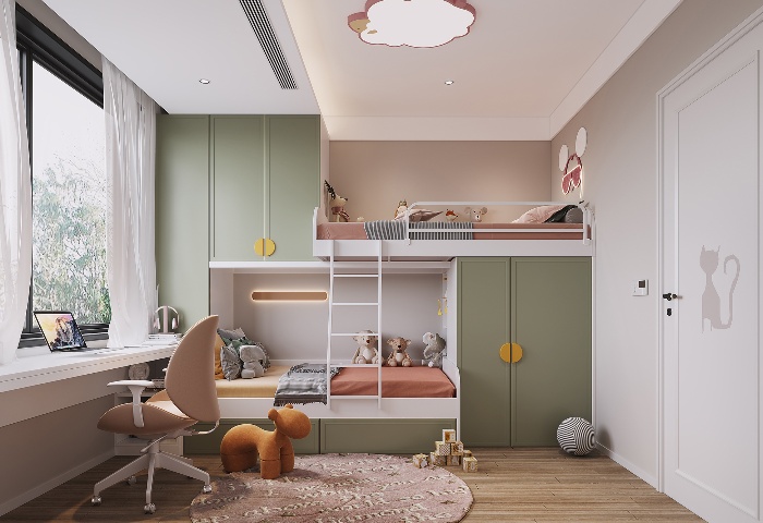 考慮足夠的睡眠空間:如果空間允許,可以放置兩張單人床,或者選擇上下鋪,為孩子們提供獨立的睡眠區(qū)域。同時,要確保床鋪的安全性,避免尖銳的邊角。