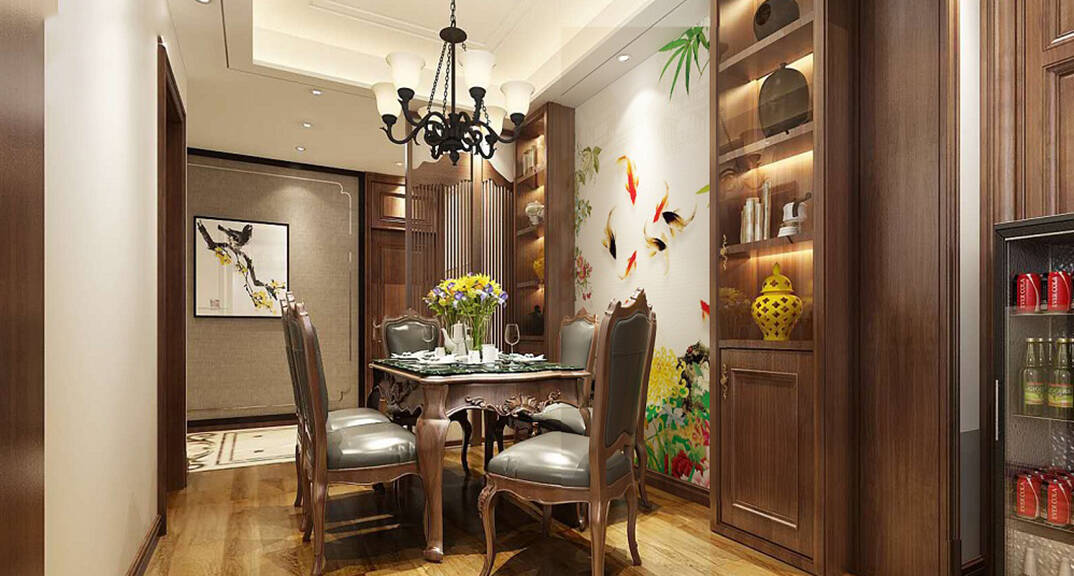 根據(jù)業(yè)主喜歡的木色搭配裝飾顏色和造型,打破中式沉悶黑暗的氛圍。運(yùn)用中式元素和新材料相結(jié)合,整體賞心悅目。