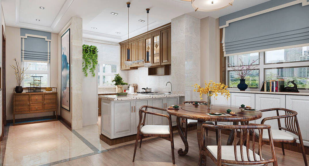 一般采用"啞口"或簡約化的"博古架"來區(qū)分;在需要隔絕視線的地方,使用中式的屏風或窗欞,通過這種新的分隔方式,展現出中式家居的層次之美。