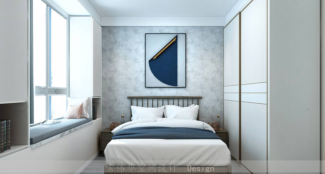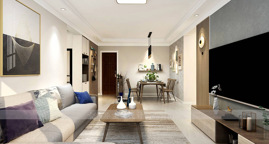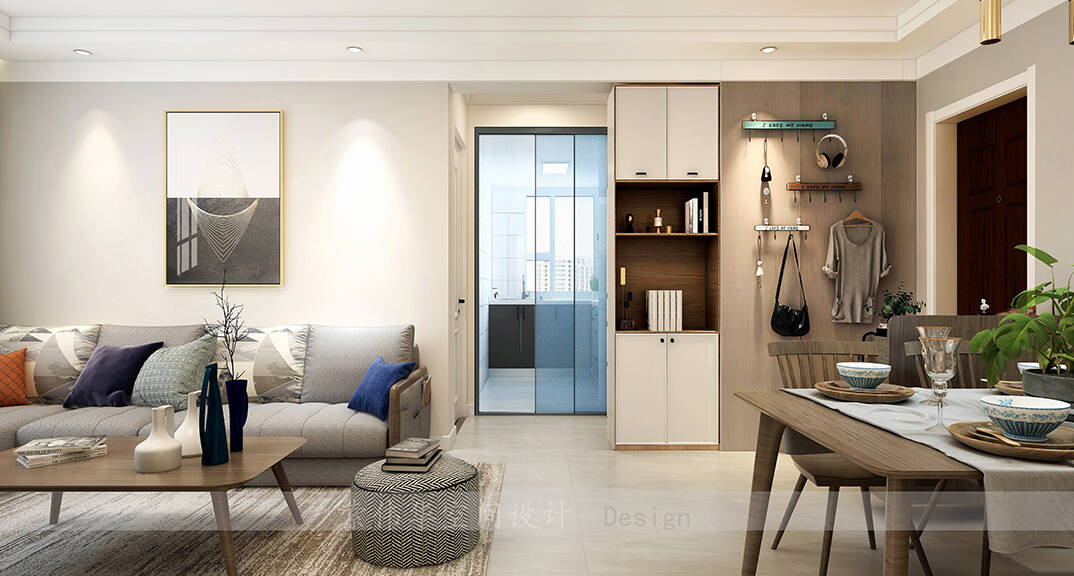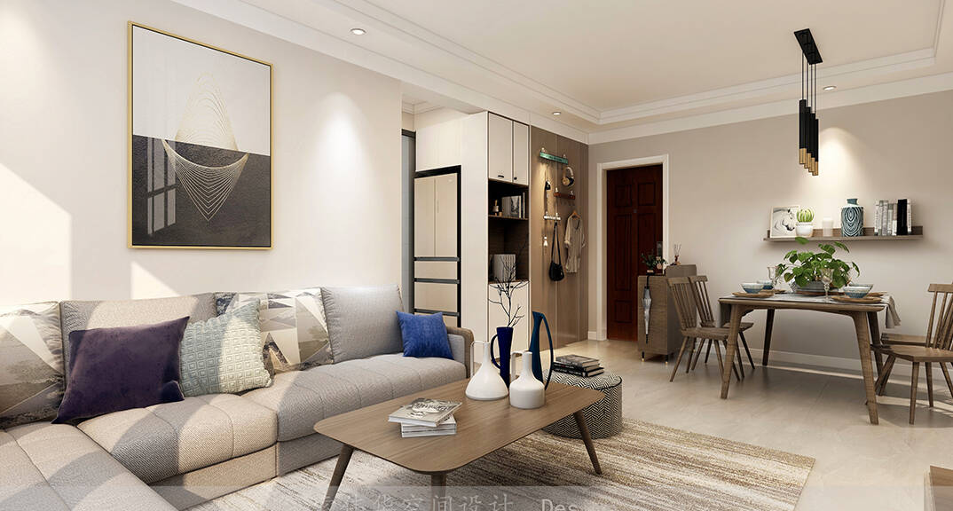 軟裝家具在色彩及材質上為設計加分,而定制柜子既美觀又可以增加收納空間,整體裝飾性與實用性兼得。客廳舒適而放松,設計師為背景墻披上溫和的色調,配合精心選擇的裝飾掛畫,整體和諧地衍生出一種高級感。