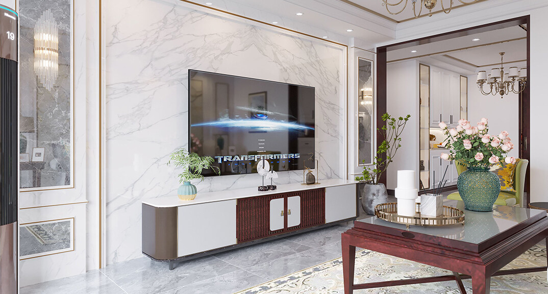 客廳采用簡(jiǎn)潔的石膏裝飾線條吊頂,搭配精致的吊燈,營(yíng)造出一種浪漫的感覺。以大理石作為電視背景墻和地面裝飾材料,光澤感極佳,在沙發(fā)區(qū)鋪上大幅棕灰色地毯,使空間區(qū)域劃分更加清晰。沙發(fā)運(yùn)用灰色調(diào)與地面顏色相呼應(yīng),拉大了空間感,搭配白色的墻面,襯托出獨(dú)具一格的知性魅力。