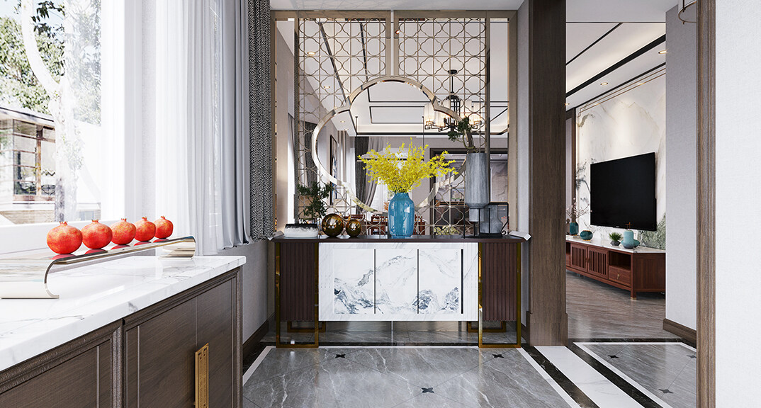 紫荊閣150㎡別墅下疊入戶玄關(guān)新中式風(fēng)格裝修案例效果圖