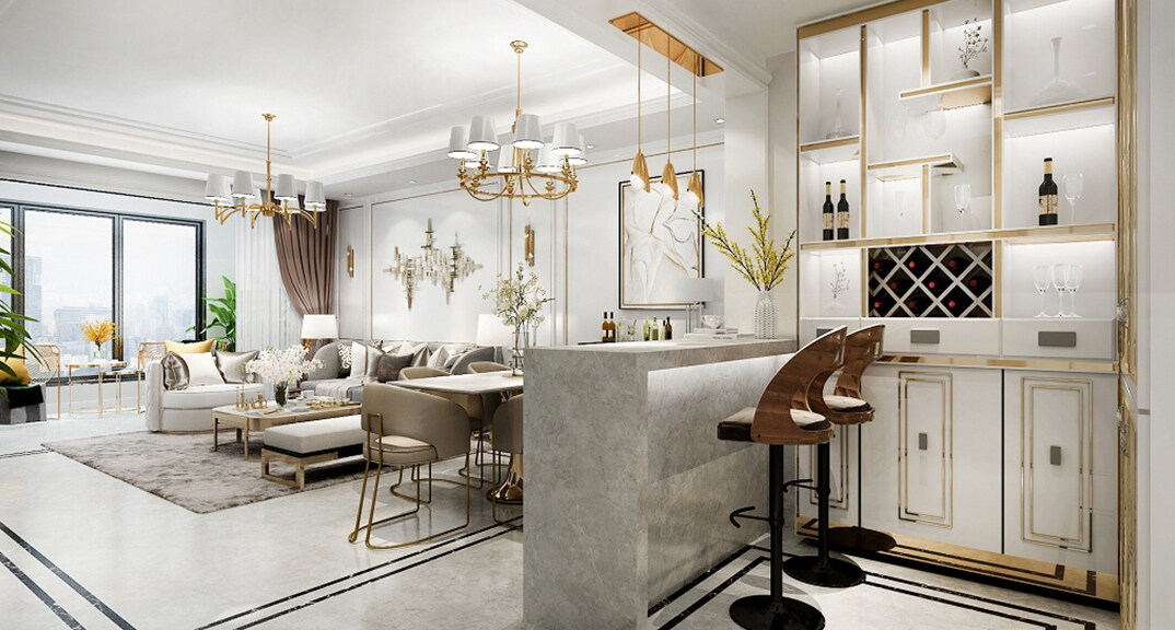 和達璟城128㎡洋房別墅客餐廳吧臺輕奢風(fēng)格裝修案例效果圖