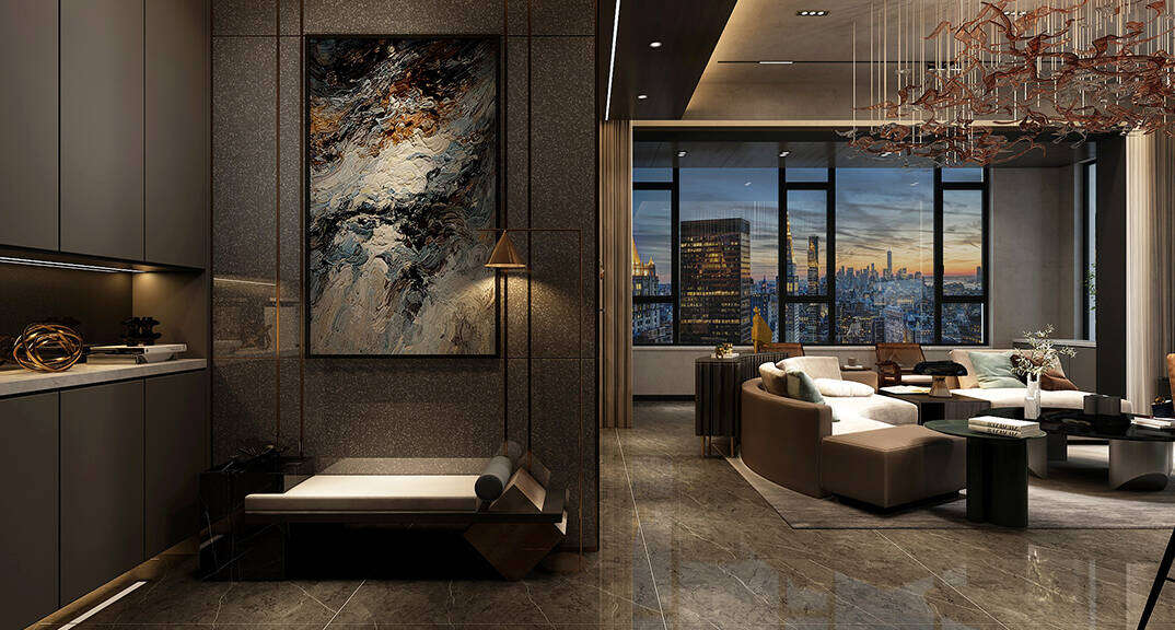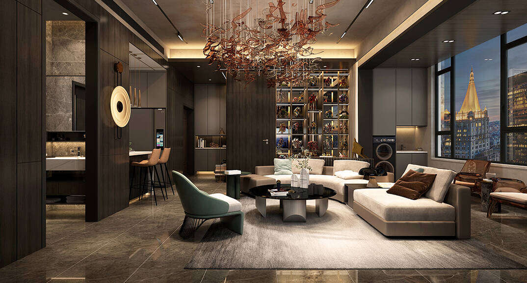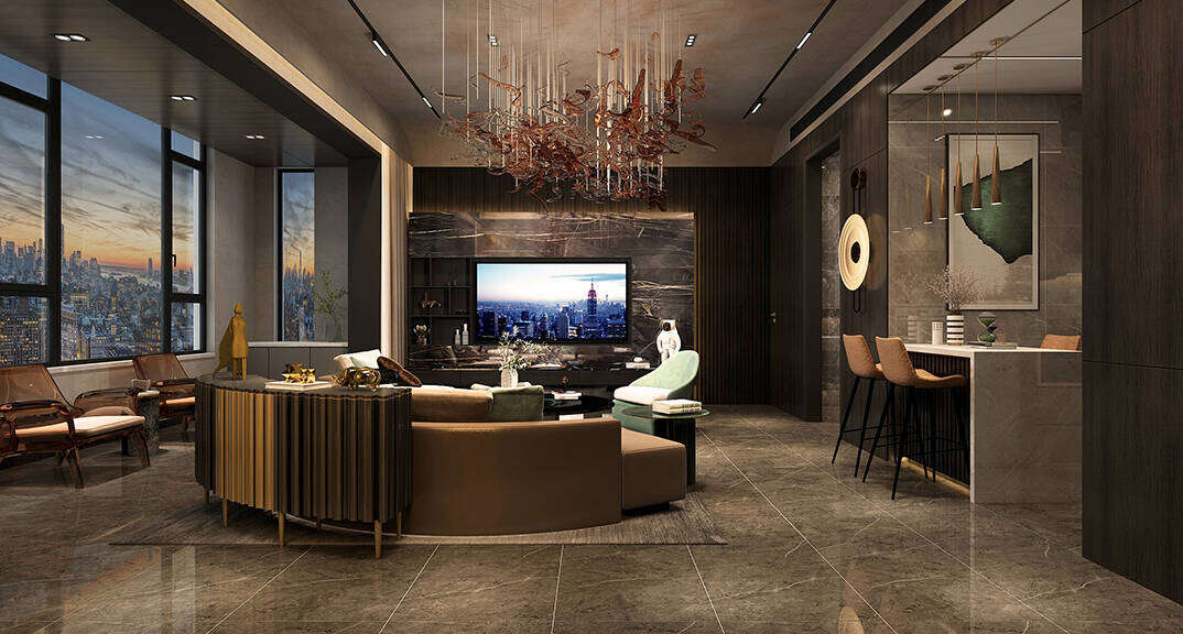 海信積米灣145m2三室兩廳客廳輕奢風(fēng)格裝修案例效果圖