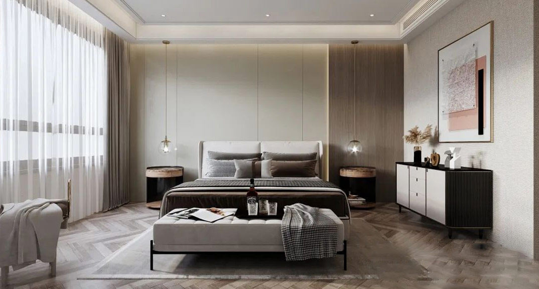日鋼綠城300㎡別墅主臥現(xiàn)代輕奢風(fēng)格裝修案例效果圖