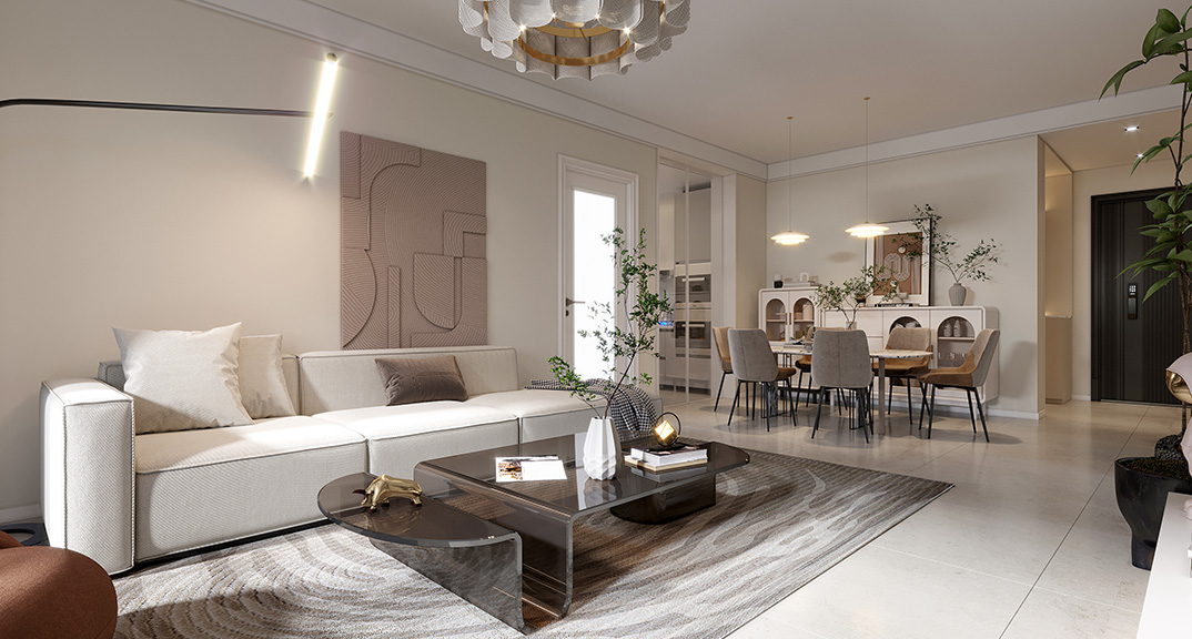 本案的設(shè)計風格為現(xiàn)代,營造簡潔、優(yōu)雅、明亮的氣質(zhì),客廳空間以打造優(yōu)雅品質(zhì)為出發(fā)點,聚集多元藝術(shù)空間展現(xiàn)。定制沙發(fā)更能展現(xiàn)空間靈動性。餐廳區(qū)域延續(xù)了客廳的色彩搭配,注重美與藝術(shù)呈現(xiàn)方式,大理石桌面、精美的花瓶與酒杯共同烘托熠熠生輝的怡人氣氛,展現(xiàn)溫馨雅致的生活情境。摒棄傳統(tǒng)的餐桌形式,開敞的客廳與餐廳、陽臺貫通共融,功能與美學在此結(jié)合,家人情感的交流隨之升華。在材質(zhì)的紋理、區(qū)域的交界、線面的分割、燈光的溫度和家具顏色的變化上,都可見設(shè)計師的巧妙用心,彰顯優(yōu)雅腔調(diào)與品質(zhì)生活,融合當代美學的居家理念