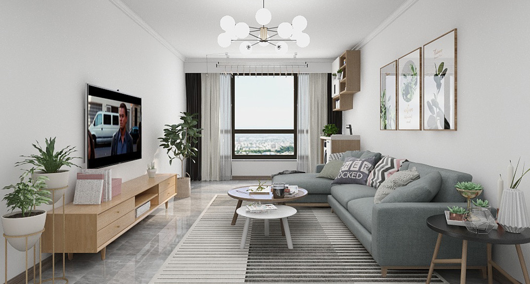 保利時代98㎡三室兩廳客廳原木風(fēng)戶型研發(fā)效果圖