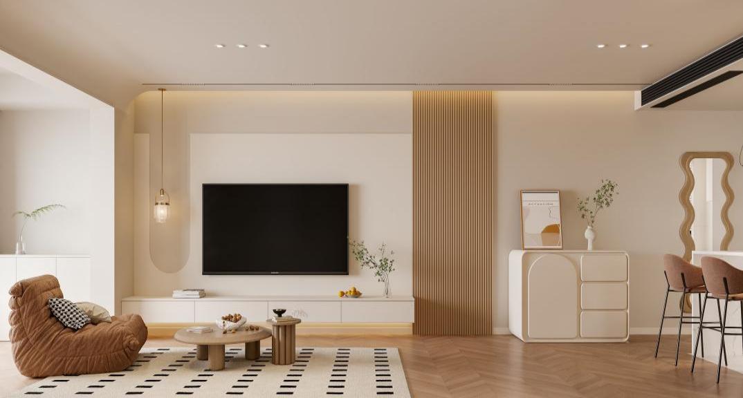 最后是次臥,打破了傳統(tǒng)方式,直接砌一個地臺,平常作為休閑娛樂用,如果有客人需要居住,放上床墊就可以滿足,功能更加靈活。整體搭配上都是同色系的材料,人字拼地板,奶白色墻面,柔光磚以及巖板等材質(zhì),搭配出柔軟治愈的奶油風格。