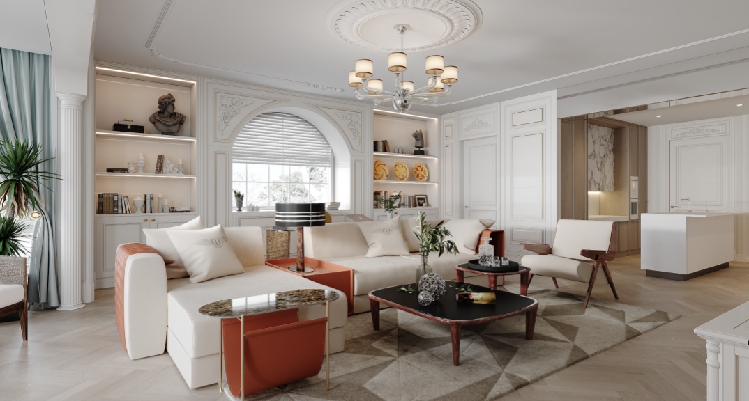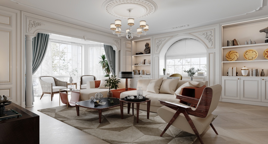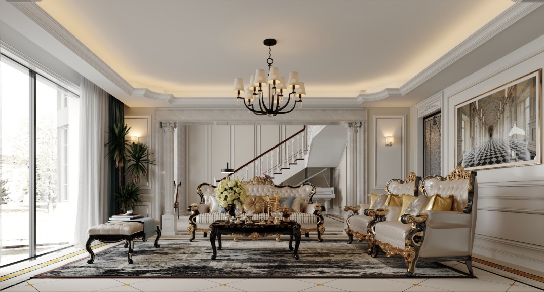 一層以會(huì)客和餐飲功能為主。挑空客廳氣勢(shì)恢宏,搭配華麗水晶燈和歐式雕花元素,彰顯尊貴氣派。餐廳與廚房相連,方便日常用餐和家庭聚會(huì)。